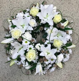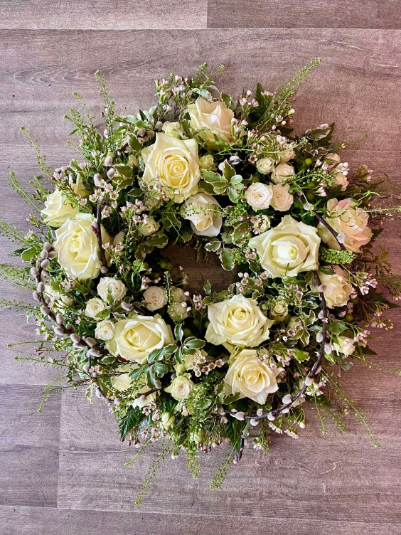 A traditional wreath of stunning mixed seasonal flowers. Different colour combinations are available.